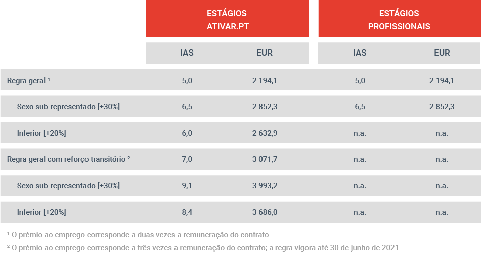 Por outro lado, e de forma transitória (até 30 de junho de 2021), passarão a ser abrangidos candidatos até 35 anos (atualmente apenas podem ter até 30 anos) e passam a ser elegíveis pessoas com mais de 35 anos se estiverem desempregadas há mais de seis meses (ao invés dos atuais 12). A comparticipação do IEFP na bolsa de estágio sobe de 65% para 75% no regime geral e o prémio-emprego, atribuído a quem converter contratos de estágio em contratos sem termo, passará de um valor máximo de 2.194 euros para 3.072 euros no regime geral.
