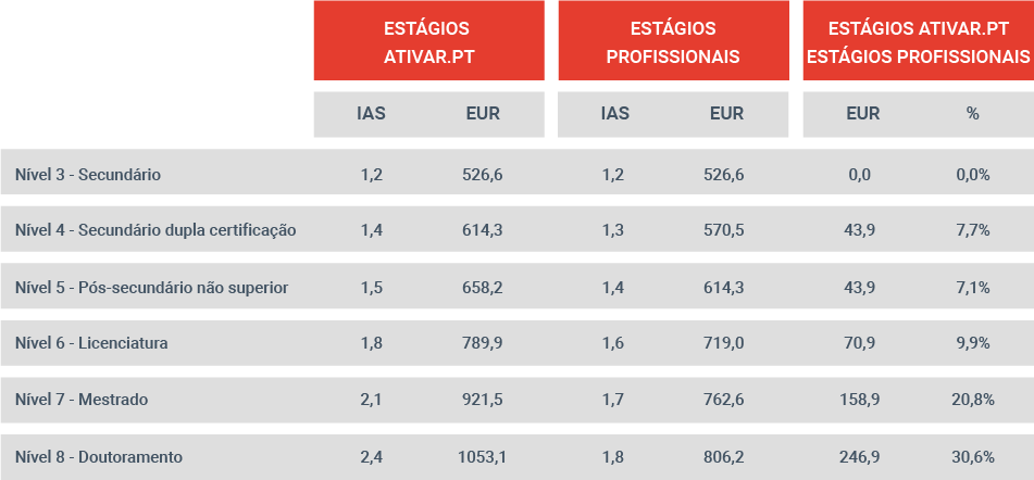 Os Estágios ATIVAR.PT, que substituem os Estágios Profissionais, incluem uma majoração nas bolsas de estágio e valorizam as qualificações. A bolsa de estágio para um estagiário com licenciatura, por exemplo, passará de 719 euros para 790 euros. O aumento da bolsa oscilará, para os candidatos com qualificação acima do secundário, entre 7,1% e 30,6%.
